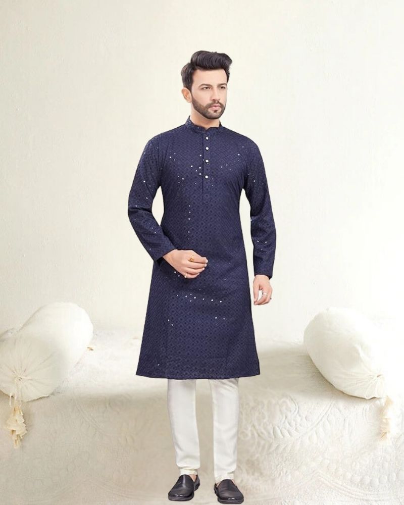 Navy Blue Chikankari Embroidered Kurta for Men, Viscose Fabric, Hand wash