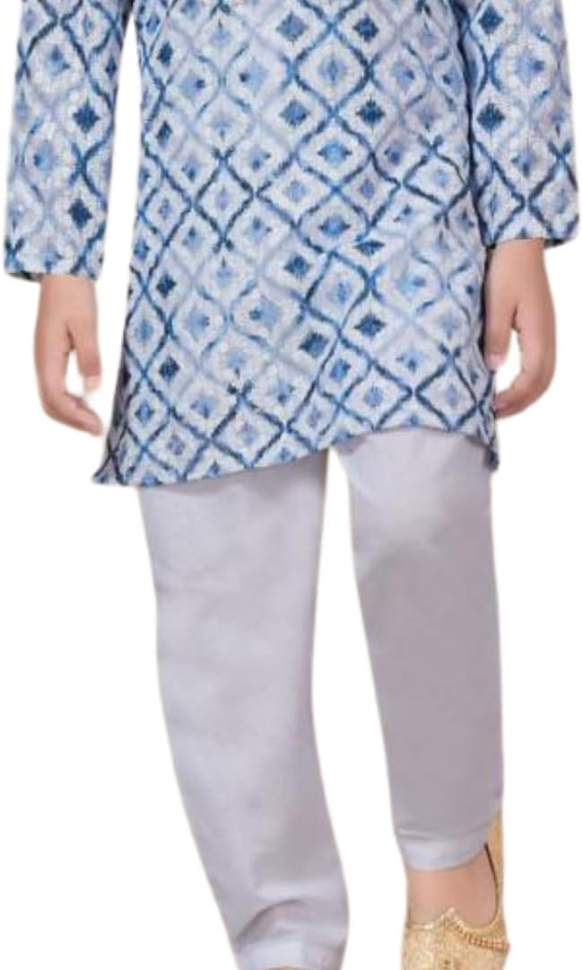 This adorable kids kurta pyjama set from Traditional Threads is perfect for any little guy. Made from breathable cotton, the aqua blue and white ikkat print kurta and matching pyjama pants will keep your boy comfortable all day long. The relaxed fit of the kurta has a flat collar and short sleeves, allowing free movement when playing. Intricate embroidery accents the collar and cuffs, adding traditional Indian details to this cultural outfit. At sizes 4-5 years, this kurta pyjama set is great for naptime, bedtime, or just lounging around the house in style. Machine wash in cold water for easy care. Boys will love showing off this colorful ethnic ensemble while parents appreciate its charming design and quality construction.