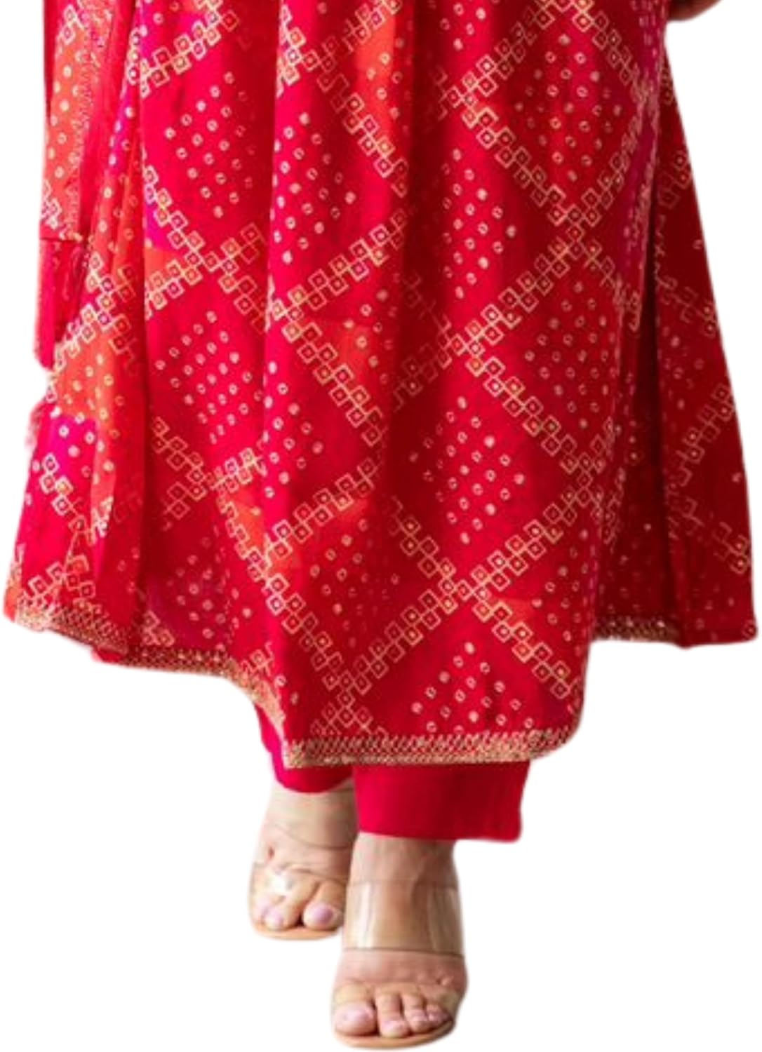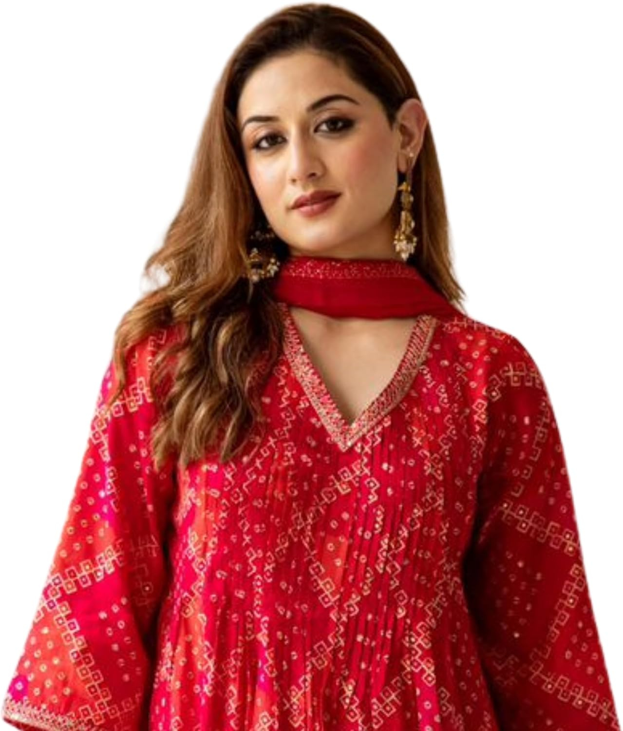 This vibrant red anarkali kurta from Traditional Threads is a stunning choice for festive occasions. Crafted from pure cotton, the breathable fabric ensures comfort all day long. The geometric printed design features an intricate pattern in shades of maroon and orange, creating a visually striking look. The kurta boasts a flattering anarkali silhouette with a V-neckline, three-quarter sleeves, and a flared hem that falls gracefully to the calves. Sequinned detailing adds a touch of glamour, making this ensemble perfect for celebrations. Pair it with the matching printed trousers featuring an elasticated waistband for a polished appearance. The set comes complete with a coordinating dupatta, allowing you to style it as desired. With its regular fit, this kurta is true to size – the model shown is 5’8″ and wearing a size S. Embrace traditional elegance with this eye-catching kurta set.