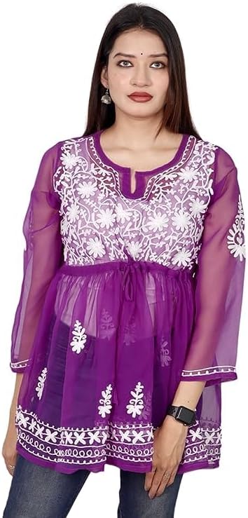 Georgette Chikankari Embroidered Tunic Top, Regular Fit, Hand Wash, Purple