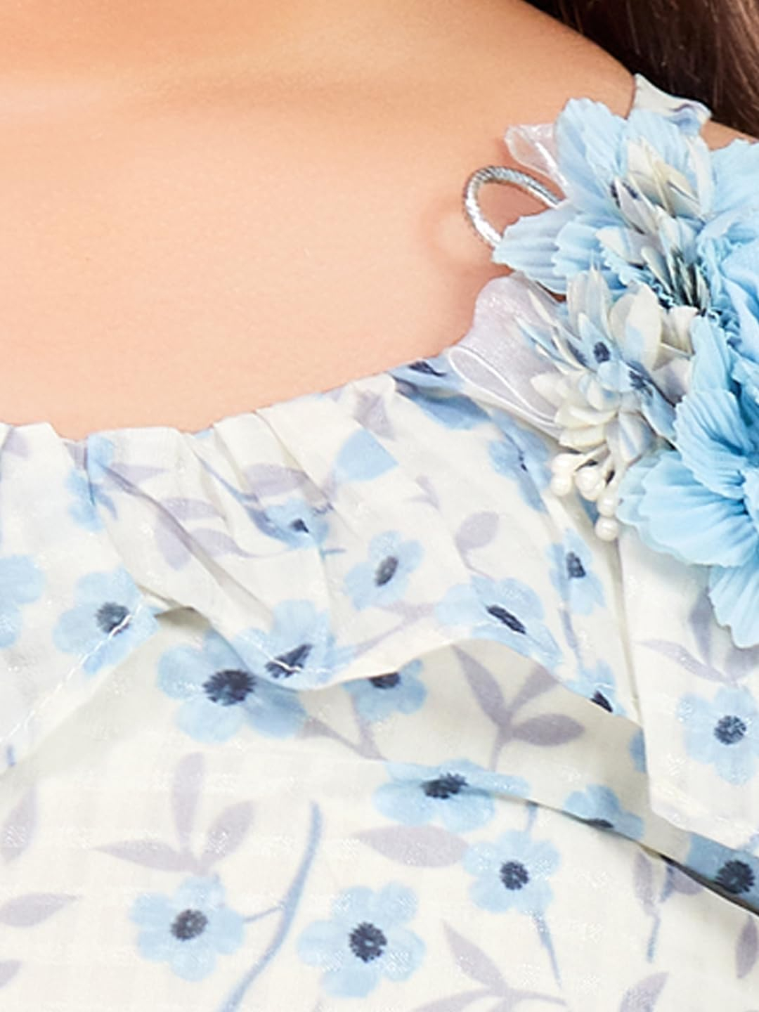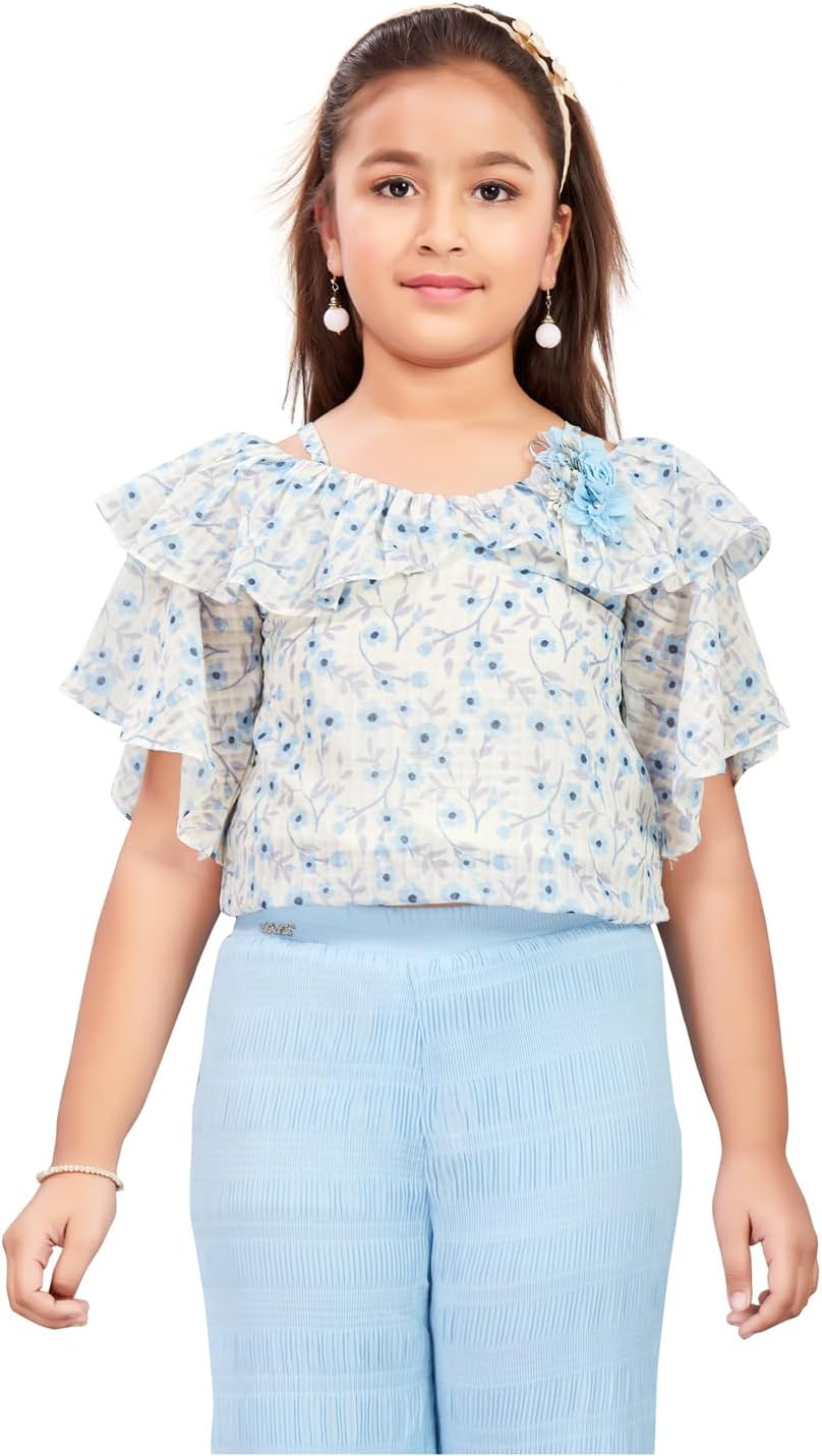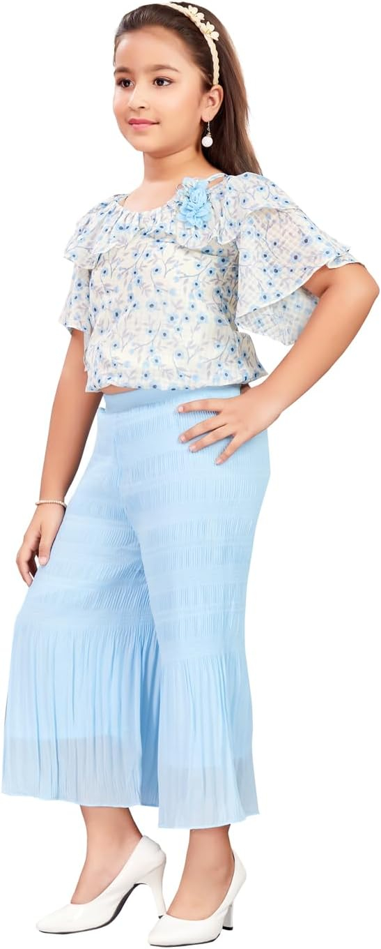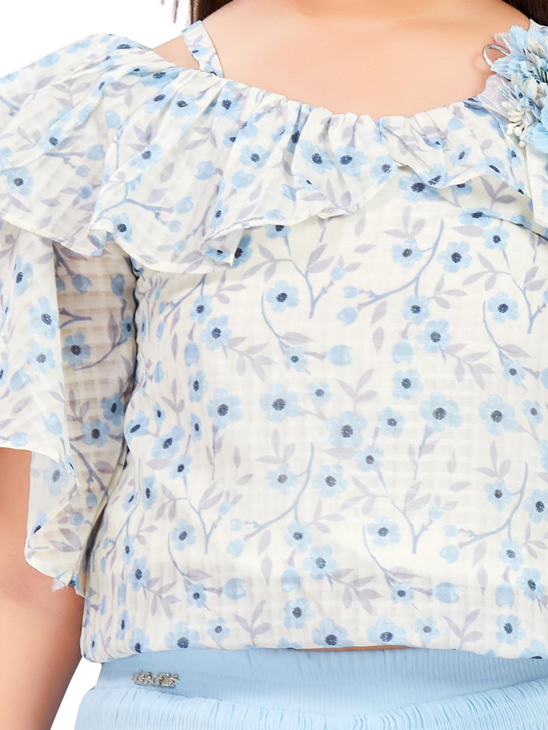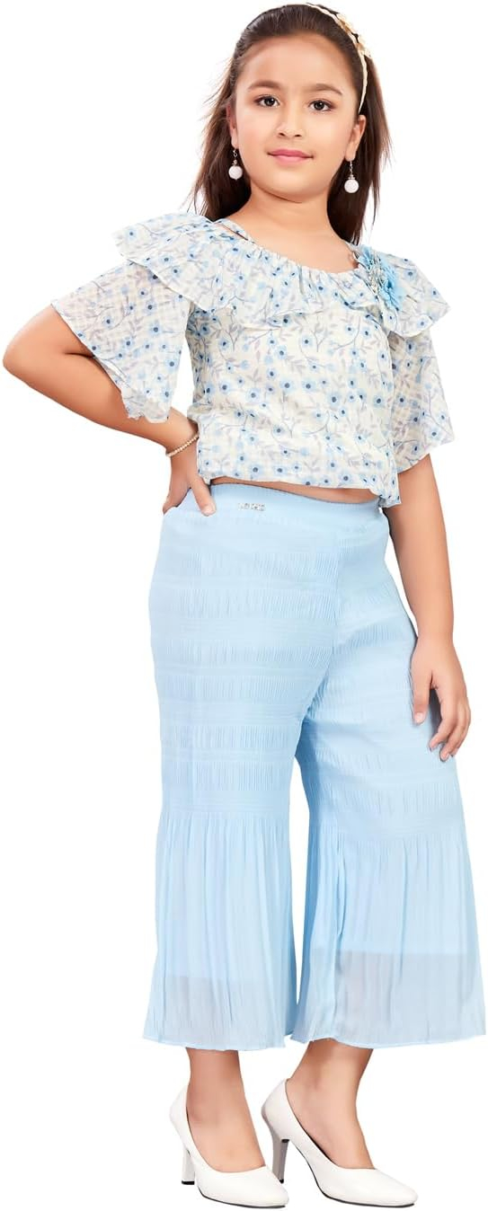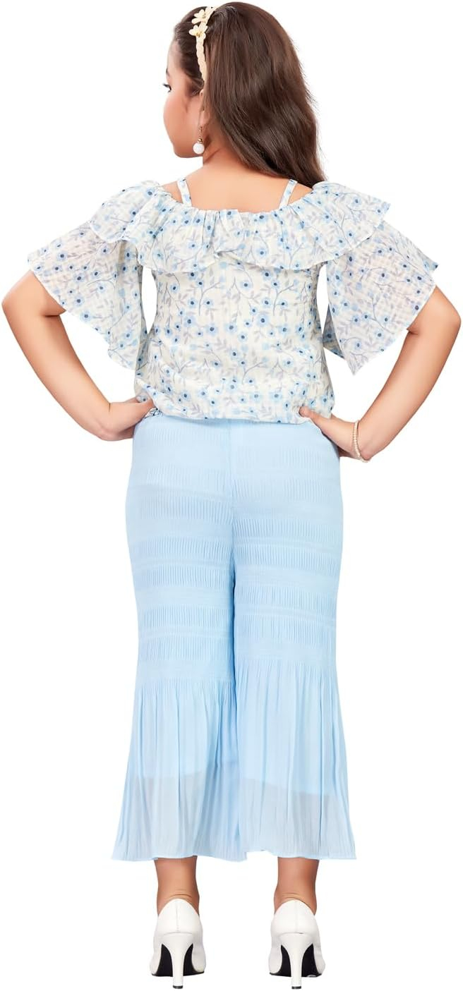 Girls Floral Printed Tunic Top and Wide Leg Palazzo Pant Set, Round Neck, White Blue