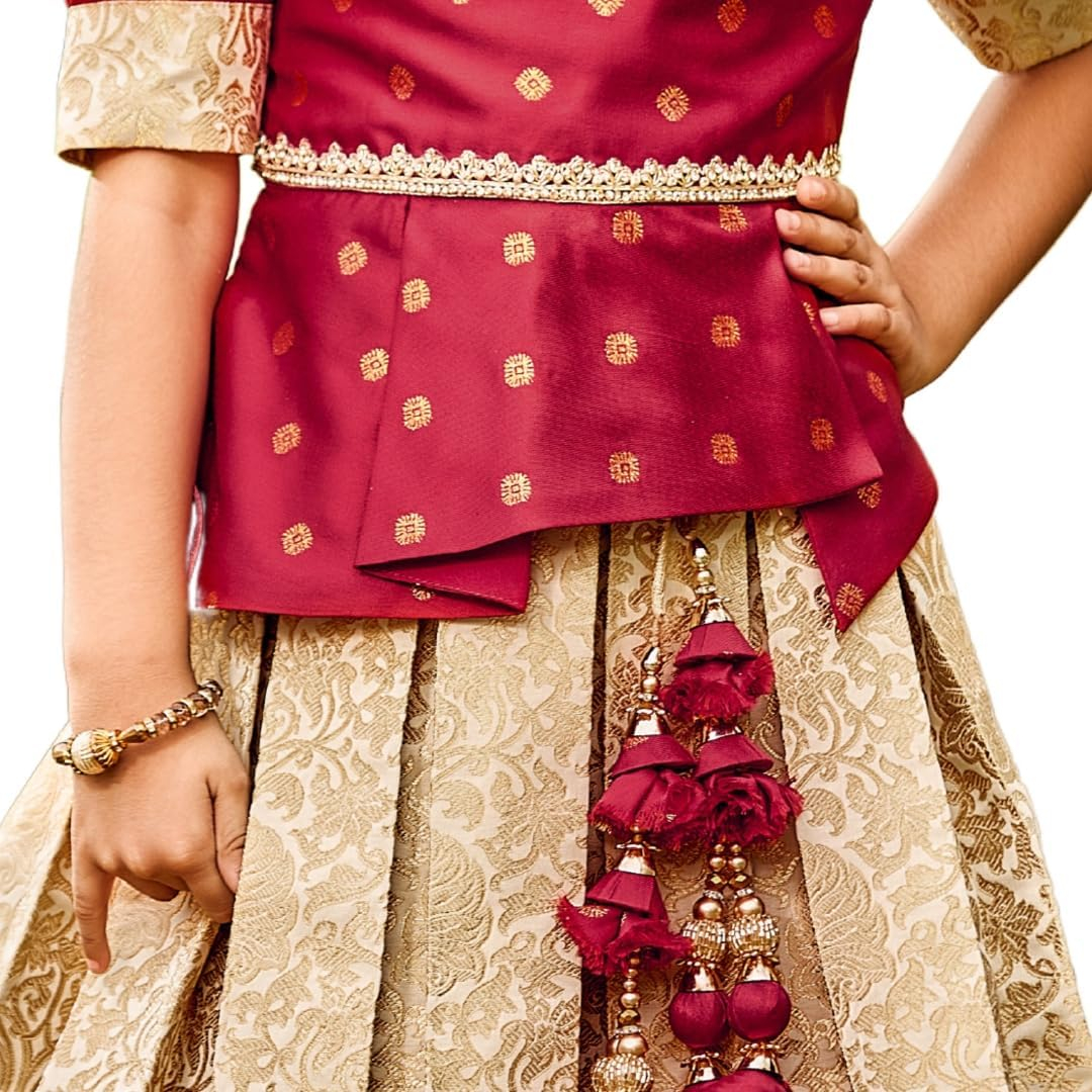 Kids Cotton Silk Pavadai Set, Maroon and Cream Colors, Indian Dress for Girls
