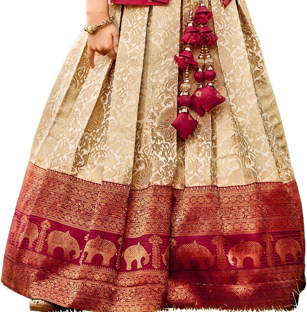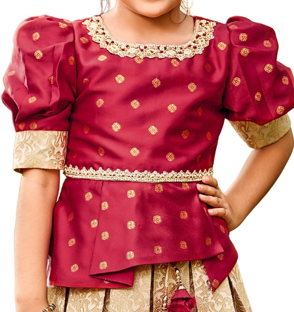 This beautiful Indian dress set for girls is crafted from a luxurious blend of maroon and cream silk. The lehenga features intricate embroidery along the hem and sleeves, which flow out in a puffed style. Paired with a matching maroon blouse this Traditional Threads pavadai set offers modest yet elegant coverage. Ideal for festivals or performances, it allows young girls to feel festive and confident in their cultural attire. The high quality silk will drape beautifully and keep the wearer comfortable throughout the event. Parents will appreciate how the classic colors and timeless design of this pavadai set will develop their daughter’s appreciation for Indian fashion and traditions.