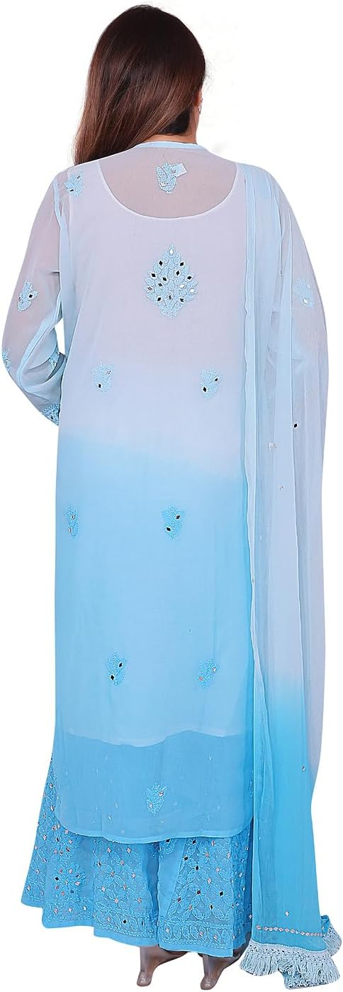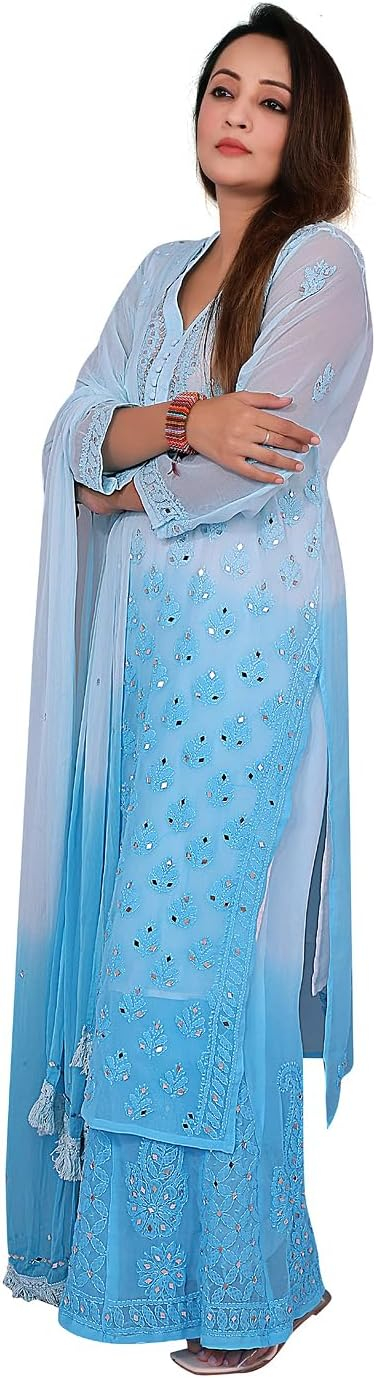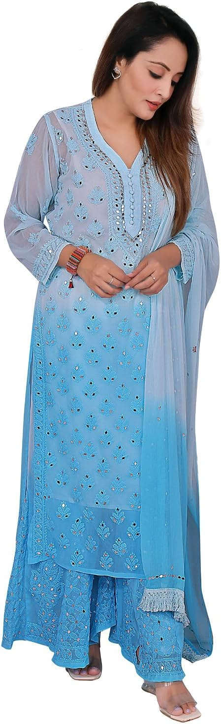 Indulge in the timeless elegance of this Traditional Threads Lucknowi Chikankari Mirror Work Straight Kurti & Sharara Set. Crafted from soft georgette fabric, this three-piece ensemble features a straight kurti adorned with intricate chikankari embroidery on the front, back, and sleeves, complemented by mirror work detailing. The set includes a sharara (palazzo pants) and a matching dupatta, making it a complete outfit. Perfect for festive occasions or casual wear, this hand-embroidered ensemble offers a comfortable and stylish look. With its vibrant multicolor palette, this kurti and sharara set is sure to turn heads wherever you go. Embrace the rich cultural heritage and craftsmanship with this exquisite traditional attire. Please note, hand washing is recommended for best care.