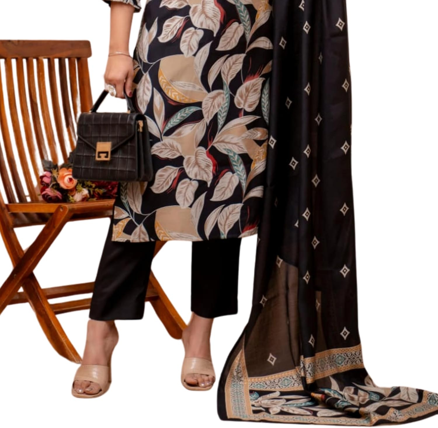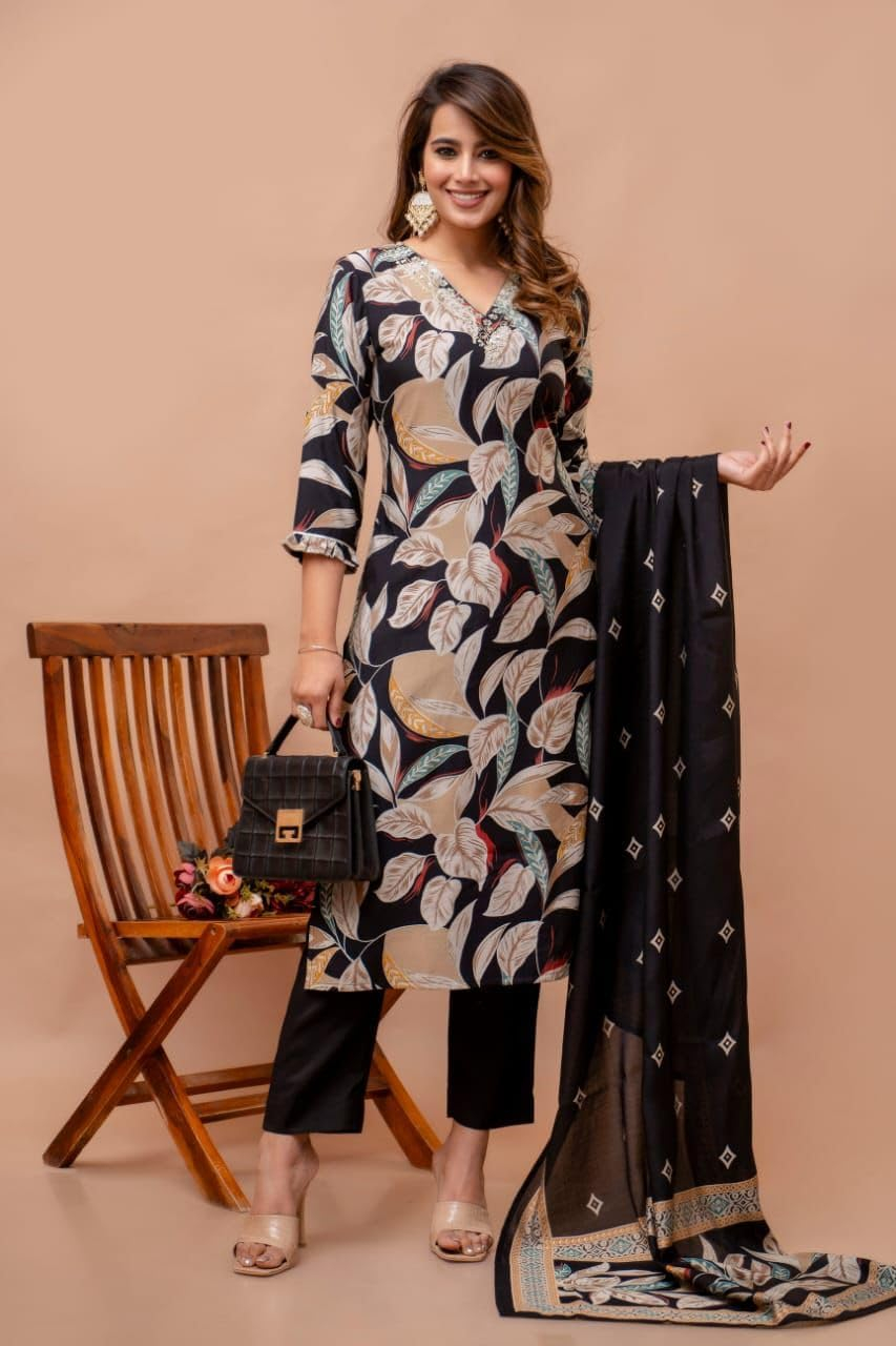 • Elegant Design: This stylish outfit features a floral print kurta, solid pants, and a complementary dupatta for a chic traditional look.